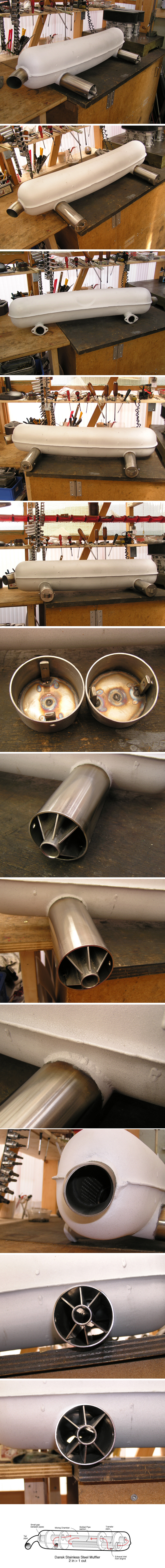 Danskマフラーは上の透視図でわかるように、左右が等長にバランスをとって排気される為に音が良いそうですが、入口の反対側に出口を追加して、ほぼストレート構造になるように改造されており、特にメカポンやウェーバー車ですとかなりパワーが出るそうです。